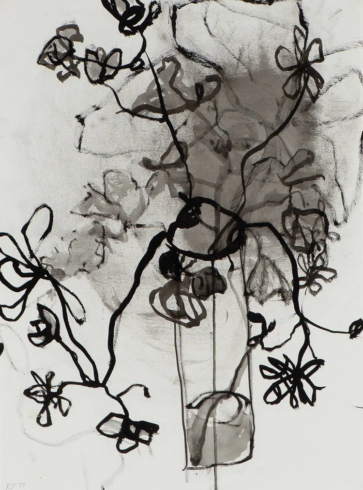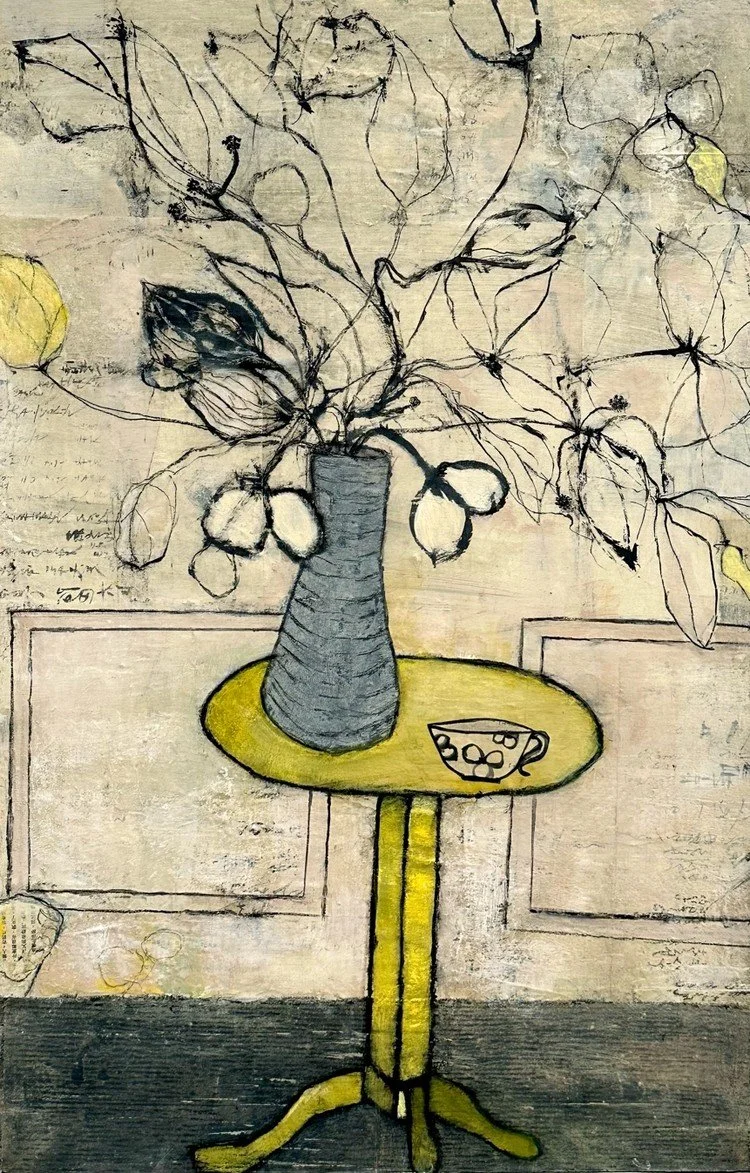 Sogetsu ikebana (Japanese flower arranging) changed how and where I look. Away from the centered full bloom, toward the bud about to open, the leaf about to fall, the space between branches. I paint with the same eye, in layers, with room to breathe. Decades as a psychologist further honed my attention to what lies beneath the surface.